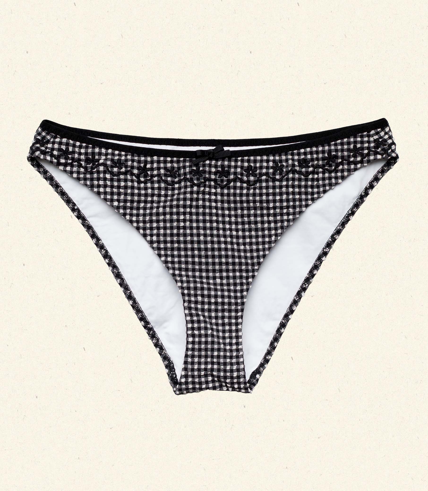 Inspired by 1950s swimwear, the Azura Bikini Bottom is crafted from a stretchy seersucker adorned with our La Maddalena Gingham and fully lined for a smooth fit. It features a low-rise waist and medium coverage cut, detailed with black floral eyelet embroidery, contrast piping, and a fixed grosgrain bow. Zigzag stitching adorns the edges.