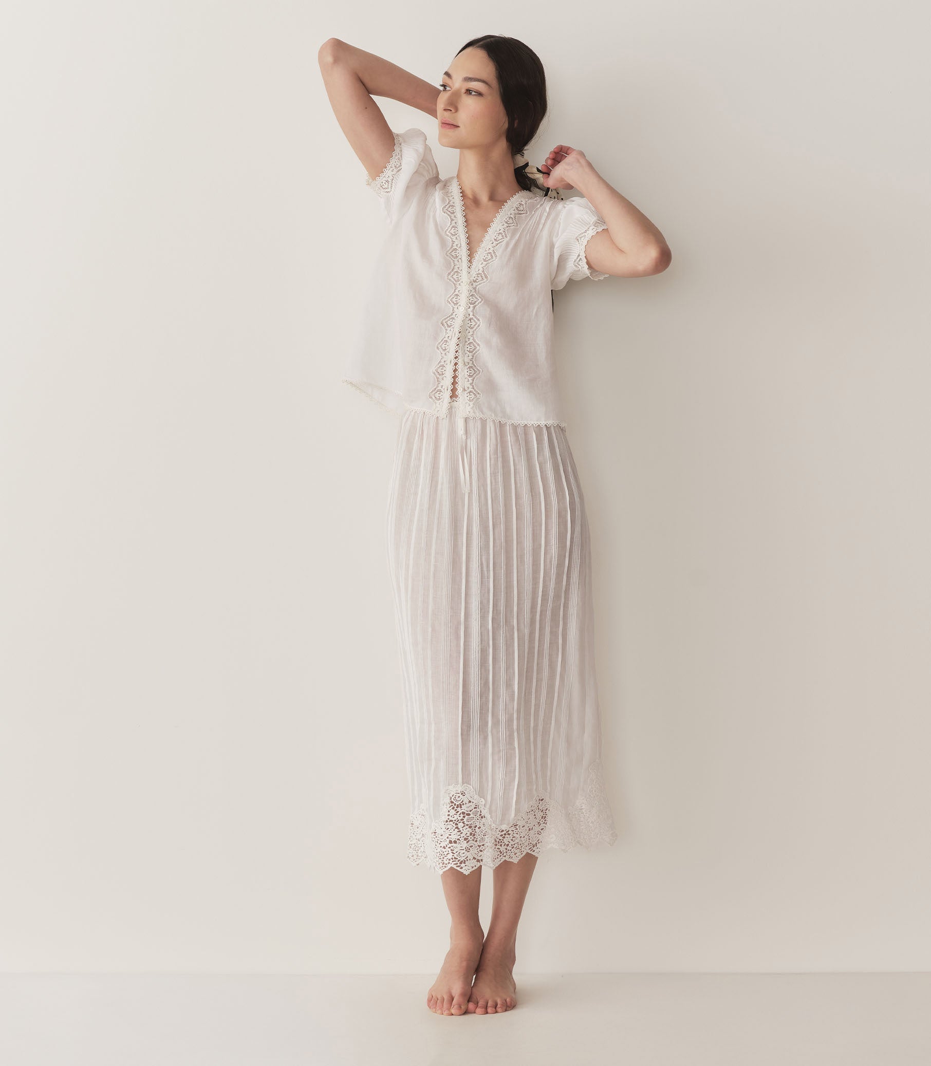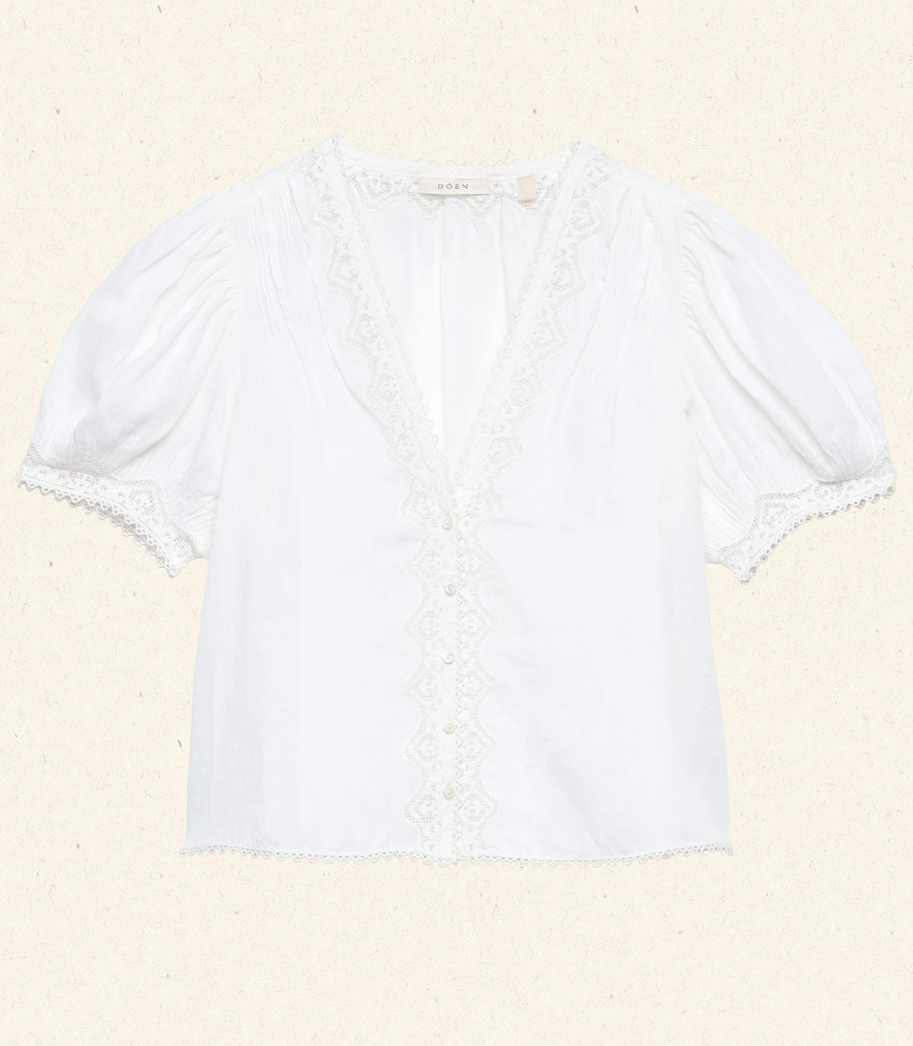 Crafted from a lightweight ramie, the Victorian-inspired Brigitta Top features a plunging V-neckline, short puffed sleeves with clustered pintucks, and intricate lace detailing. A line of starburst buttons extends down the center front. Wear it loose, or tuck it into your favorite high-waisted jeans.