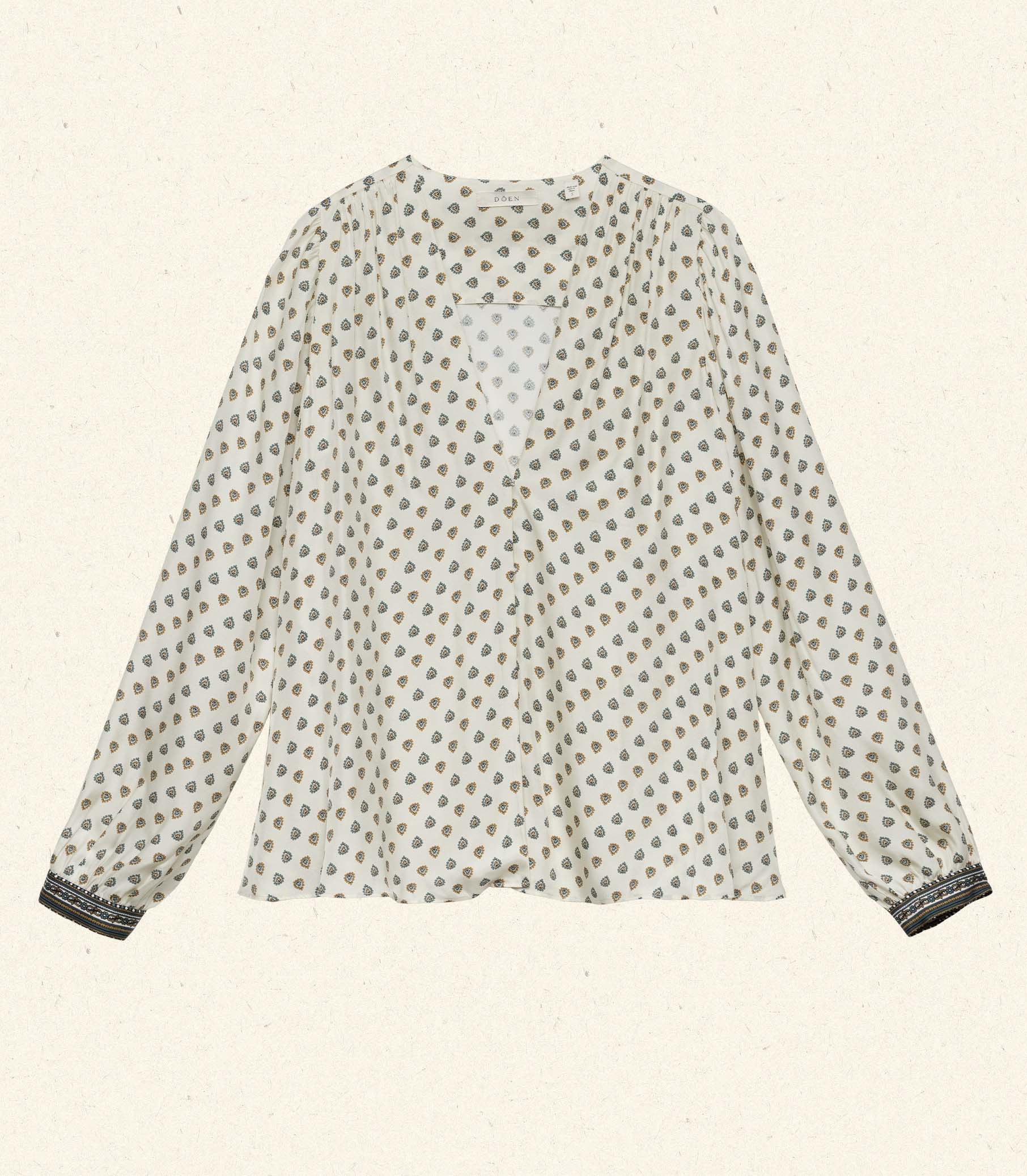 Crafted from a buttery silk-viscose twill, the ‘70s-inspired Candace Top features a plunging V-neckline, a drapey cut, generous full-length sleeves with self-covered buttons at the cuffs, and shirring at the shoulders for texture. Three hidden snap closures fasten at the front. Inspired by a vintage silk scarf from our styling team’s personal collection, our Riviera Foulard print features placed borders at the cuffs.