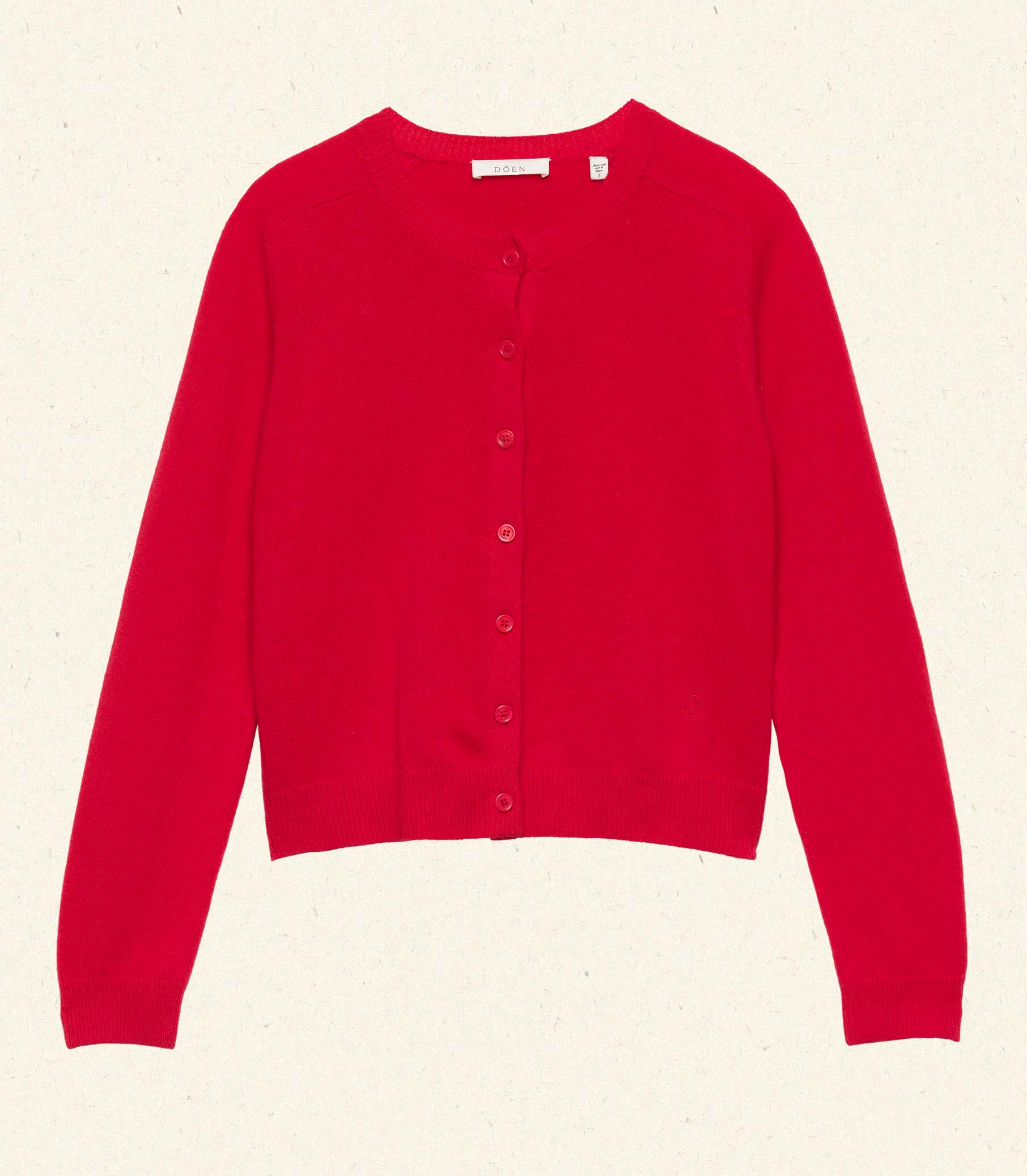 In the softest cashmere, the Claudine Cardigan features a crew neck, a fitted silhouette, full-length sleeves, and ribbing at the neckline, sleeve cuffs, and hem. A line of mother-of-pearl buttons extends down the front.