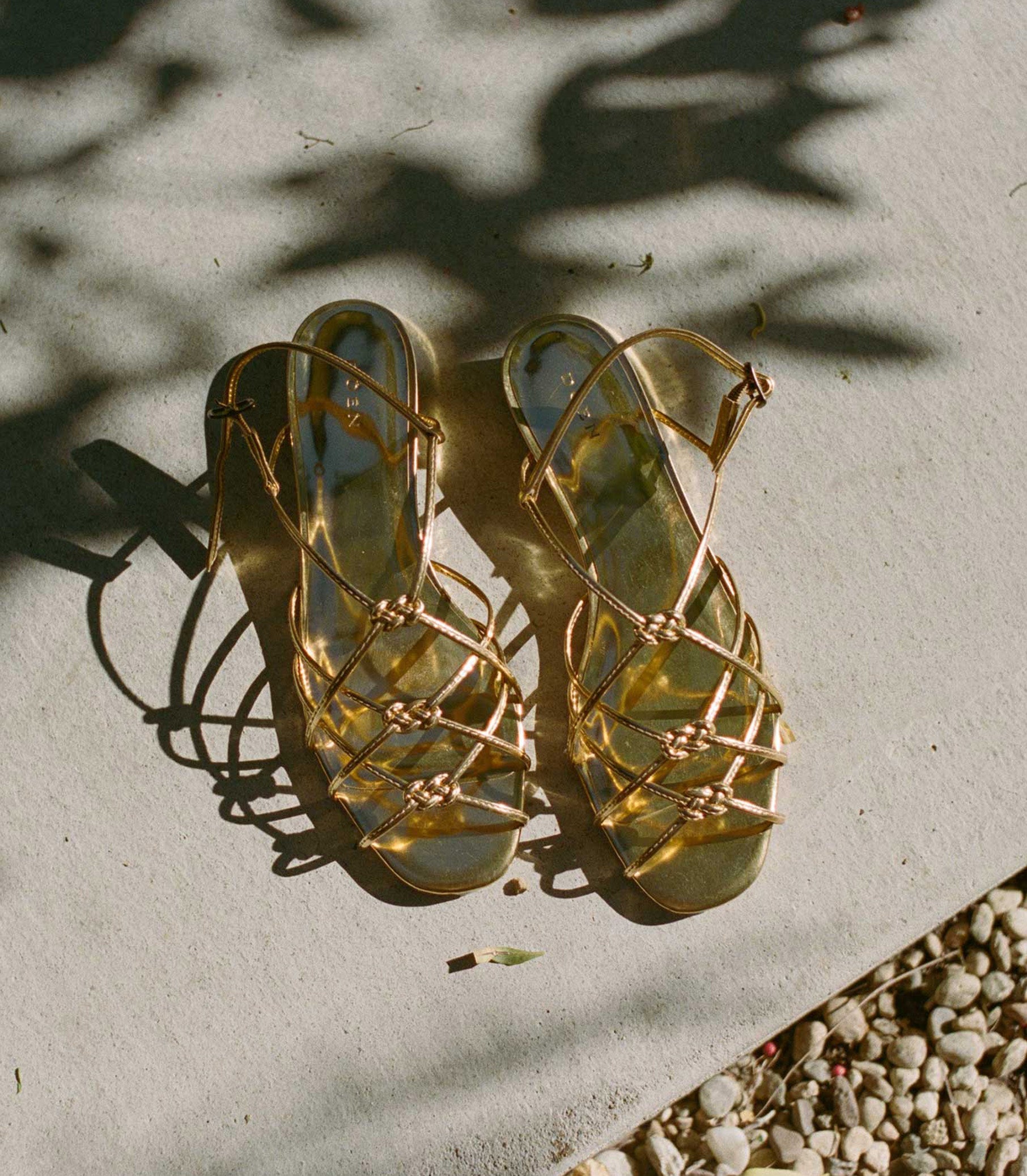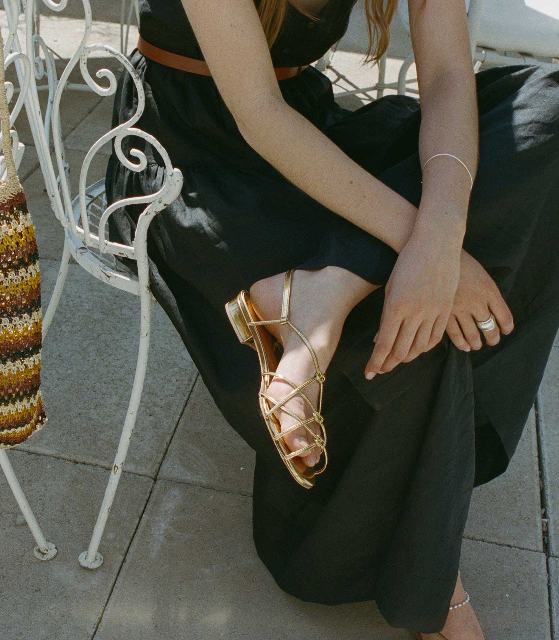 Inspired by the coastal ease of the French Riviera, the Corsica is a wearable everyday sandal that can be dressed up or down. Reimagined in a high-shine gold metallic nappa leather from a certified responsible tannery, it features a petite block heel, three knotted straps, and a slim ankle strap that fastens with a buckle.