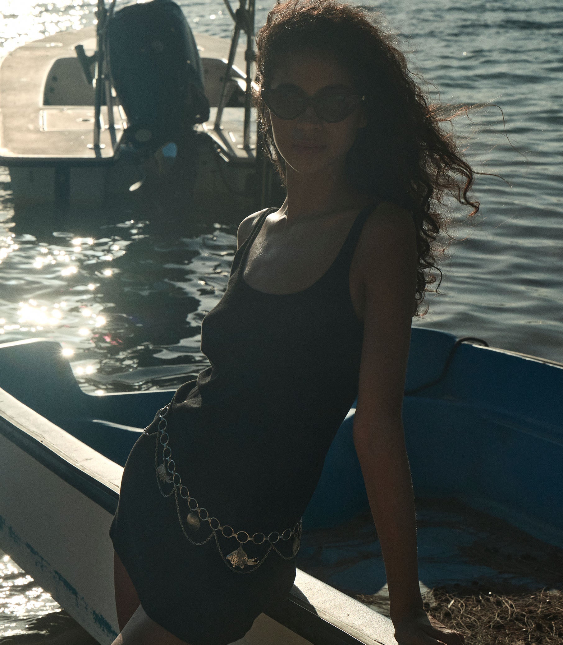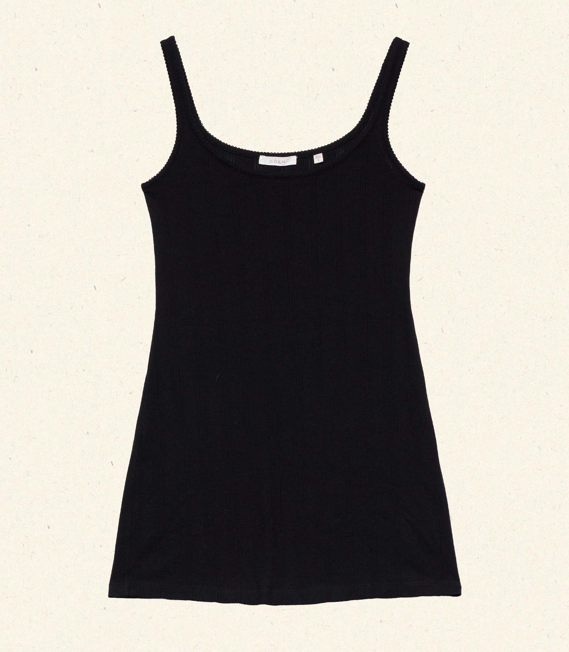 In soft organic cotton pointelle, the Cynthia Dress is an effortless pullover style with a fitted silhouette, mini hemline, slender straps, and a scoop neckline trimmed with delicate elastic lace.