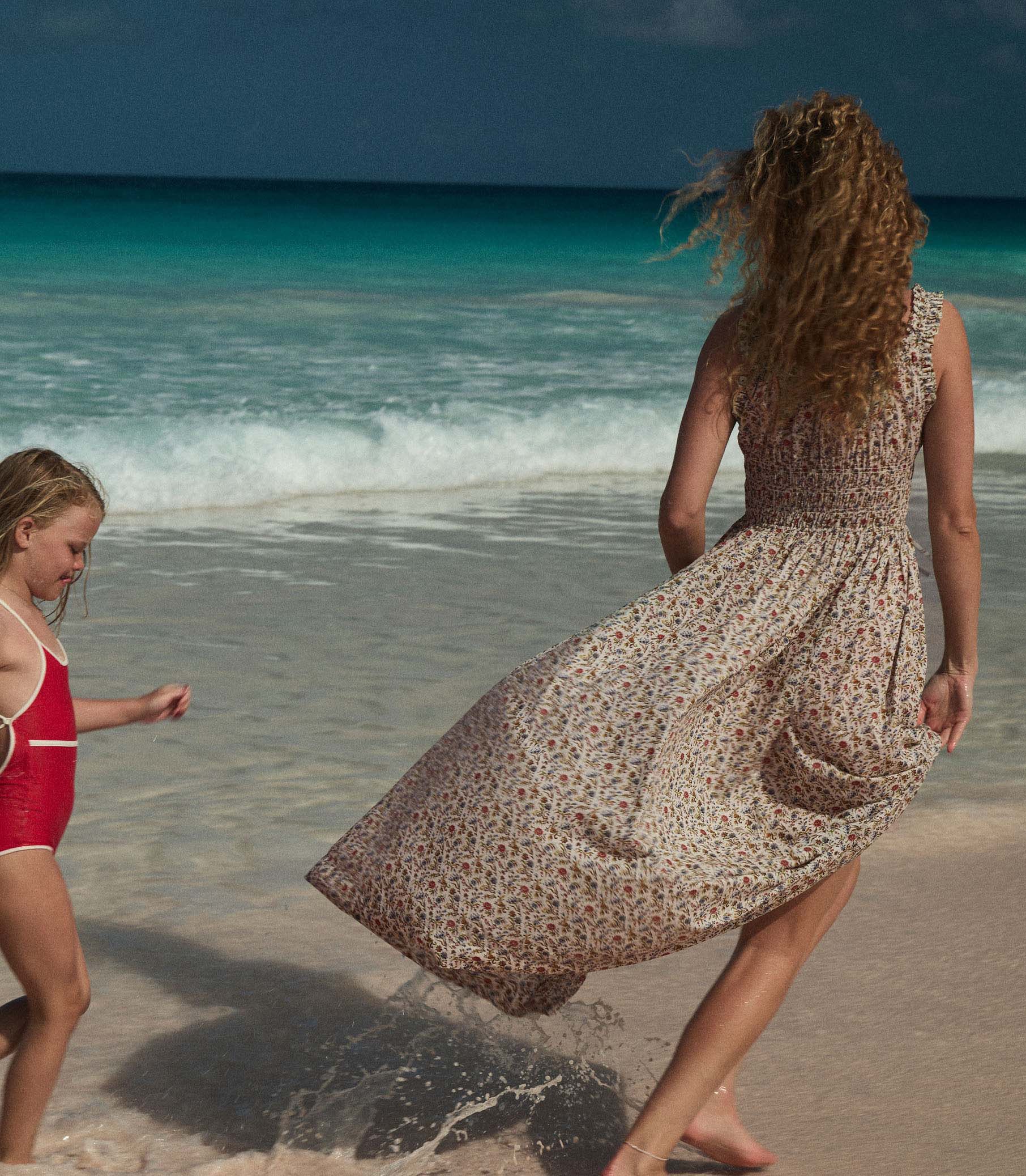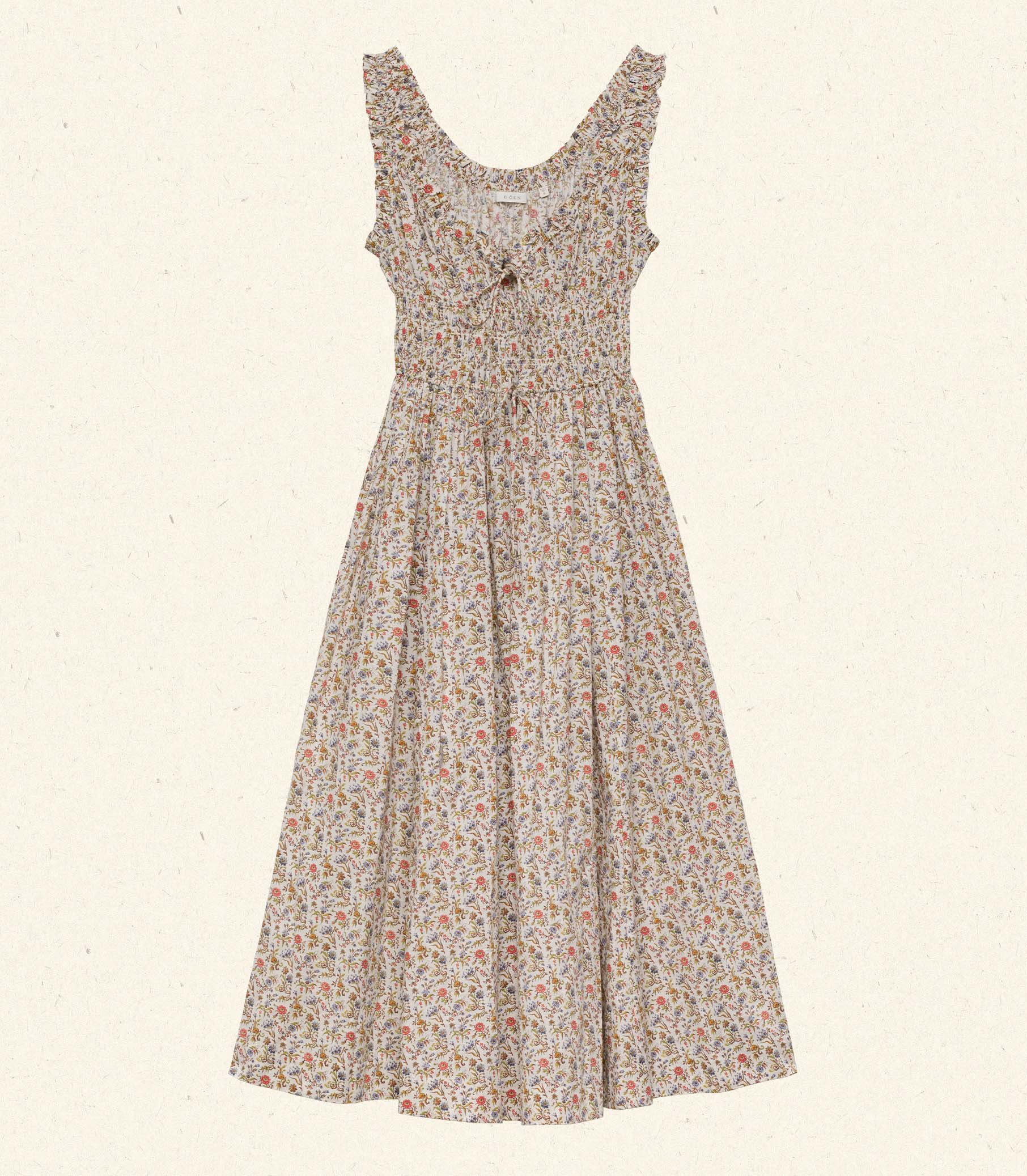 Crafted from a soft, organic cotton lawn adorned with our antique-inspired Jardin du Château print, our Emmaretta Dress features a scoop neckline with an adjustable tie, a gathered bust, and wide straps trimmed with petite ruffles. A smocked bodice—finished with a second adjustable tie—gives way to a full, ankle-grazing skirt.