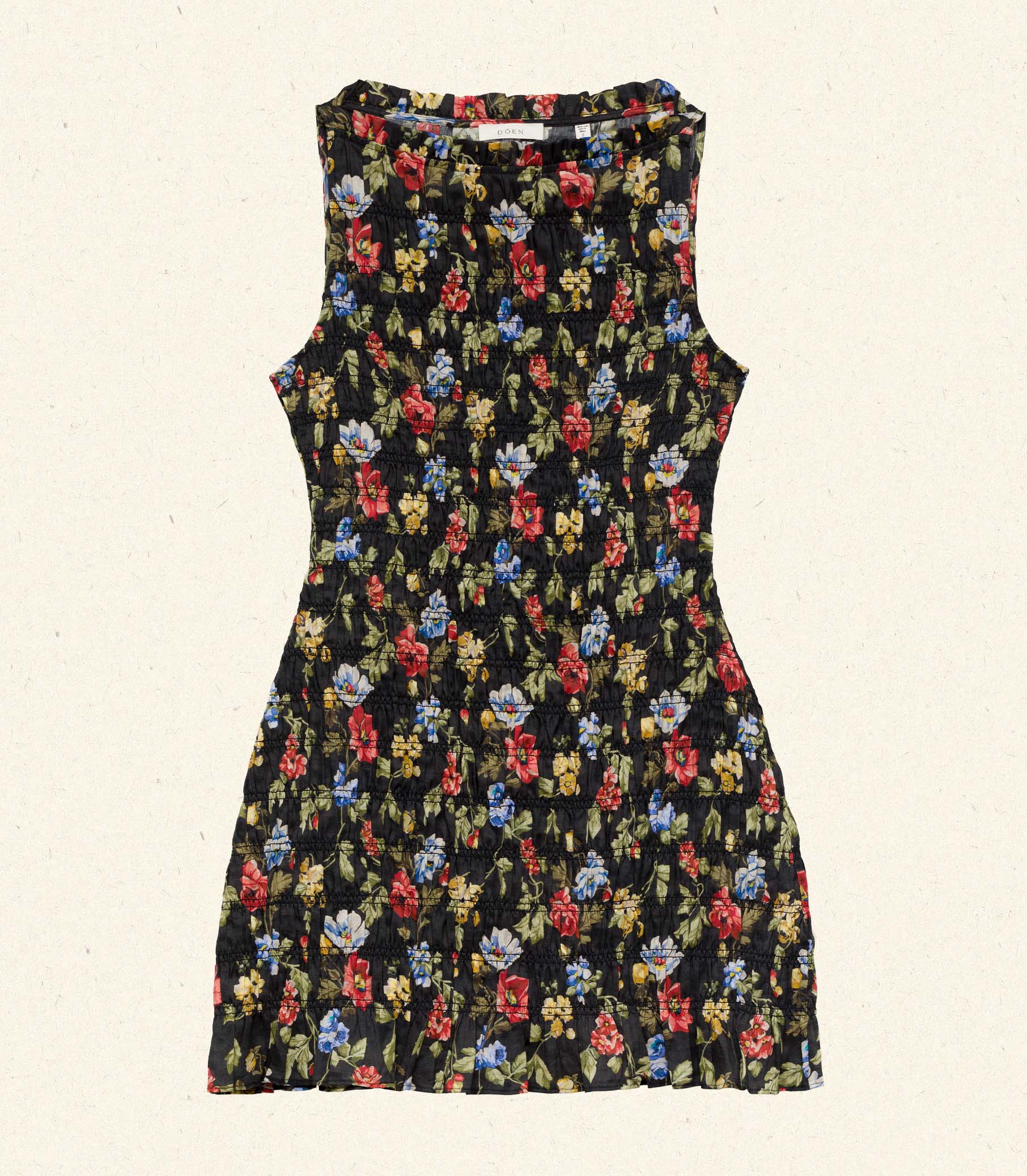Crafted from a lightweight ramie and rendered in a 1930s French block print, the Gianna Dress is a pullover sleeveless style with a bateau neckline and allover elasticized smocking. A fitted silhouette gives way to a mini-length skirt with a ruffle at the hem.