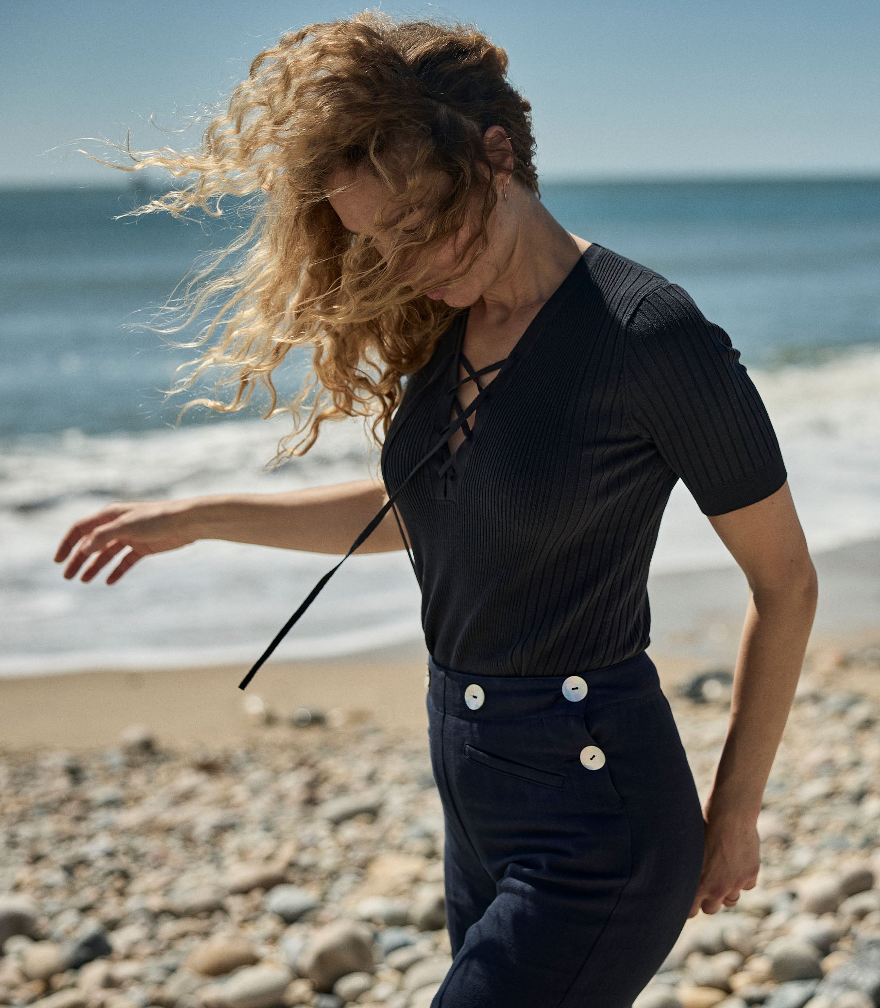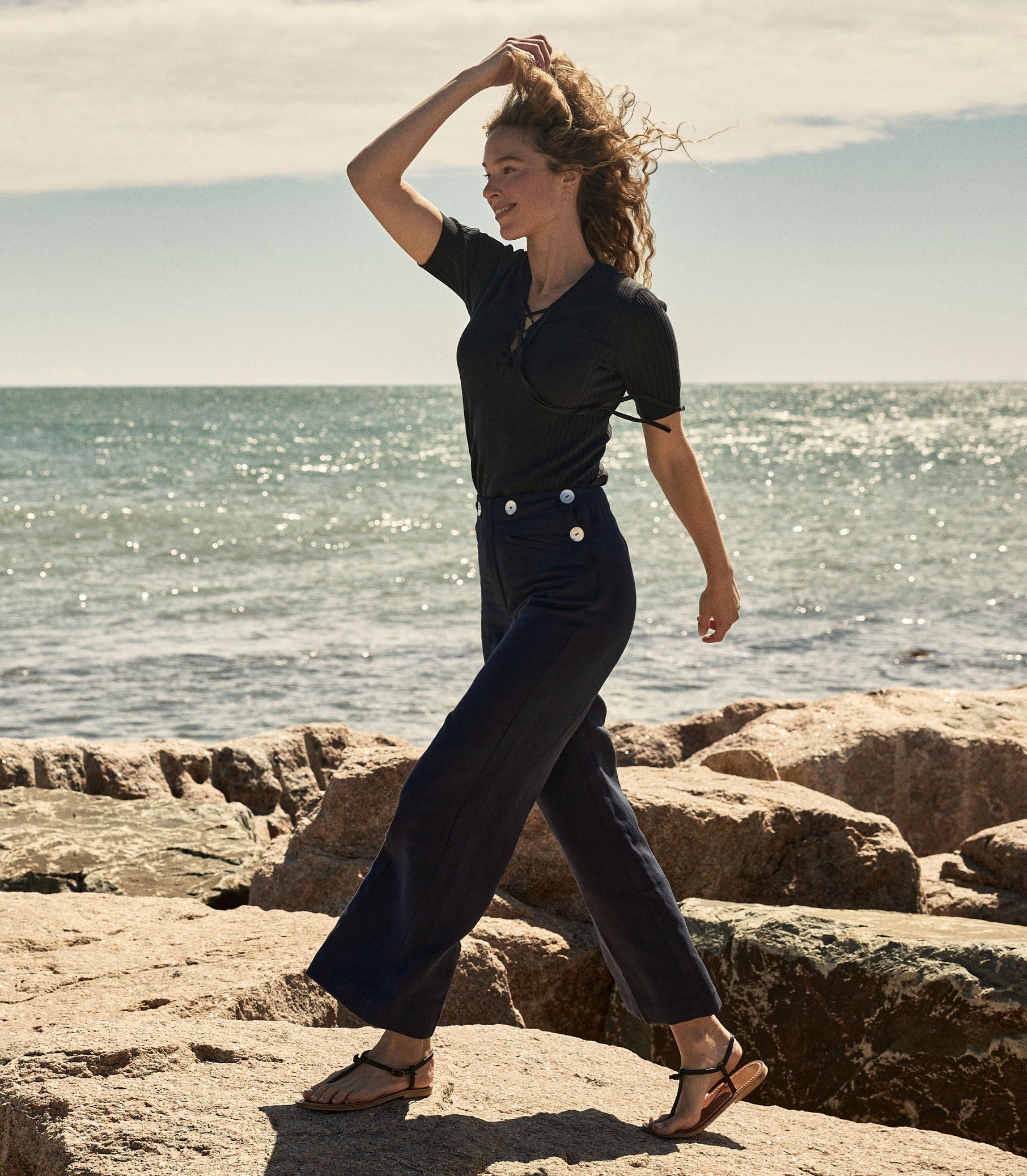 Reimagined for warmer days in a lightweight, organic cotton-linen twill, the DÔEN Heirloom Glenne Pant takes cues from ‘60s sailor pants. It features a high waist, a structured wide-leg, and welt pockets at the front, plus a single welt pocket at the back. The waistband is adorned with two fixed shell buttons, plus additional shell buttons that fasten at both sides. Our co-founder Katherine loves wearing with the ribbed Auguste or Ilaria Tops.