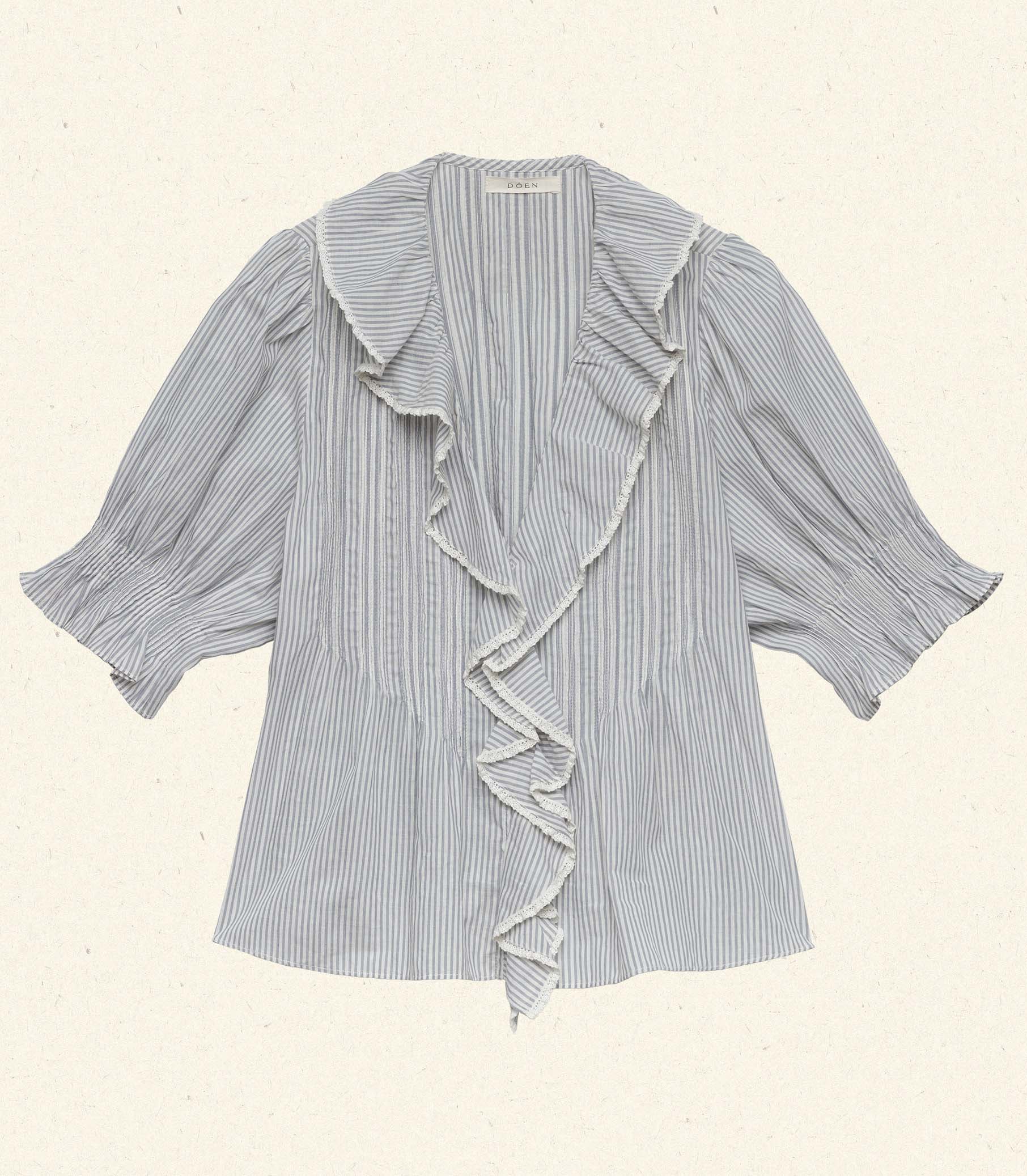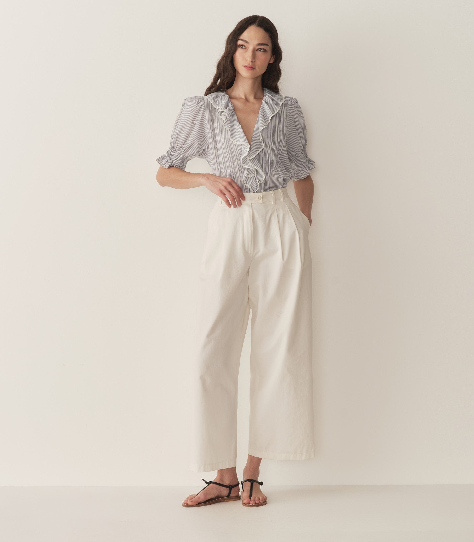 Crafted from the softest organic cotton voile and reimagined in our Adelaide Stripe, the Henri Top features a plunging V-neckline framed with cascading lace-trimmed ruffles that extend down the bodice and delicate clustered pintucks at the yoke, back, and short puffed sleeves. A line of hidden starburst buttons run up the center front.