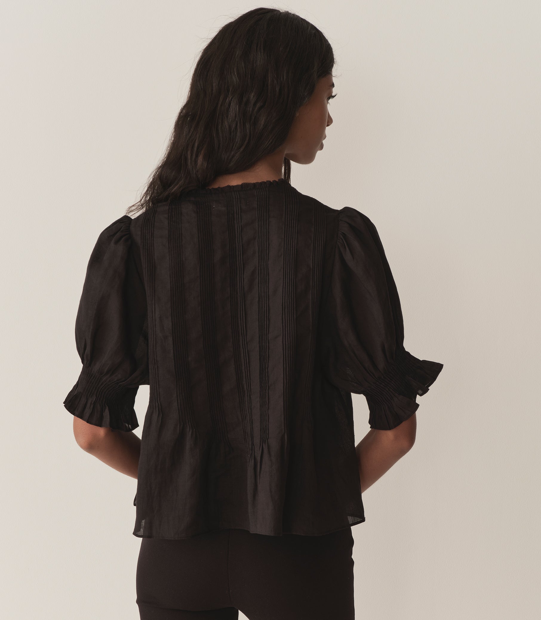 Crafted from a diaphanous ramie, the Edwardian-inspired Karlie Top features a plunging V-neckline adorned with ruffles and delicate clustered pintucks at the yoke, back, and short puffed sleeves. A line of starburst buttons runs up the center front. Wear it loose, or tuck it into your favorite high-waisted jeans.