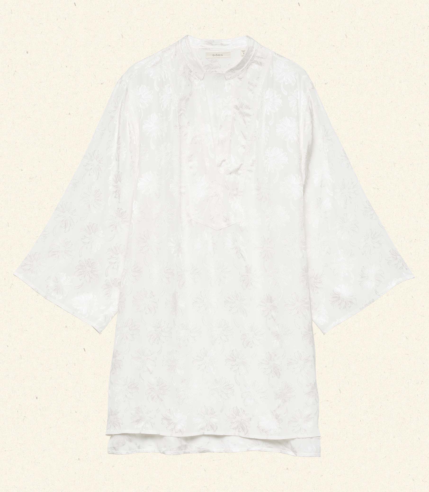 In floral jacquard reminiscent of a vintage tunic from our content team's personal collection, the Leona Dress features a high neck with a Nehru collar, three-quarter-length bell sleeves, and a gently flared A-line silhouette. The Leona comes with a matching detachable scarf that can be tied as a belt for a cinched look.