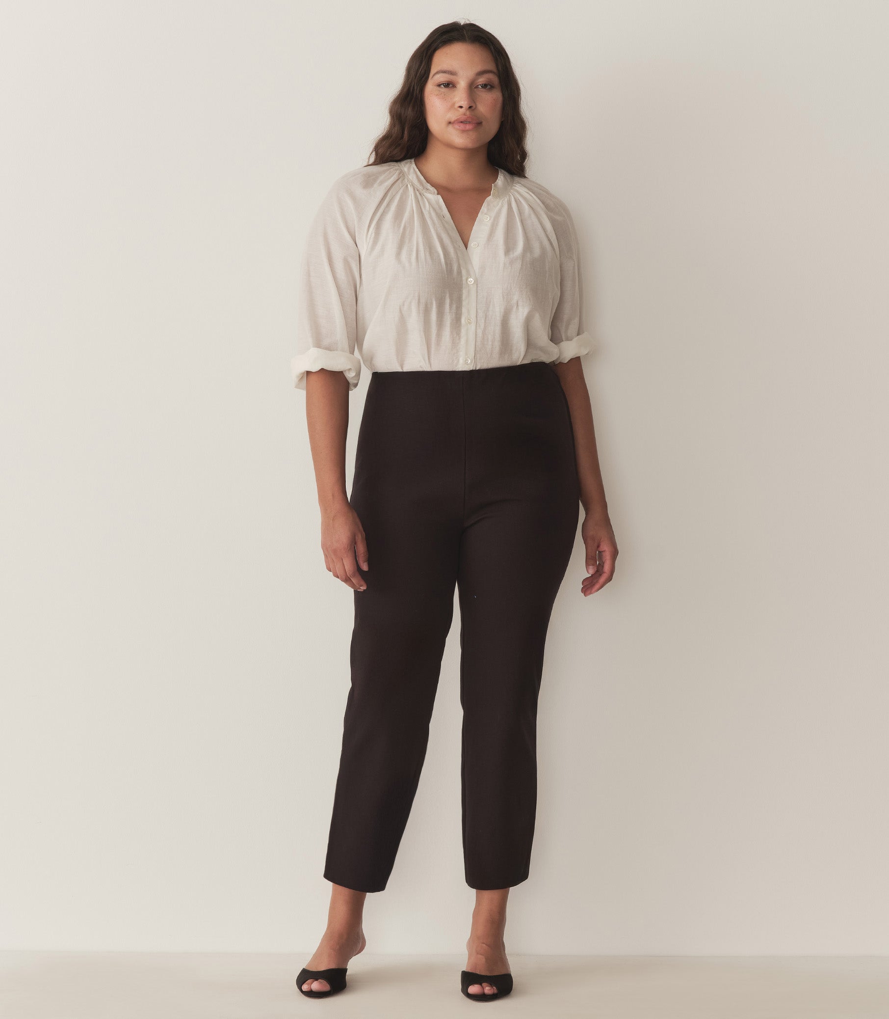 Updated in a stretchy cotton blend that holds its shape, the Lula Pant—which takes cues from ‘60s pedal pushers—features an ultra-high rise, a slim fit, and a tapered leg with playful split details at the cuffs, plus an invisible side zipper with a single horn button closure.