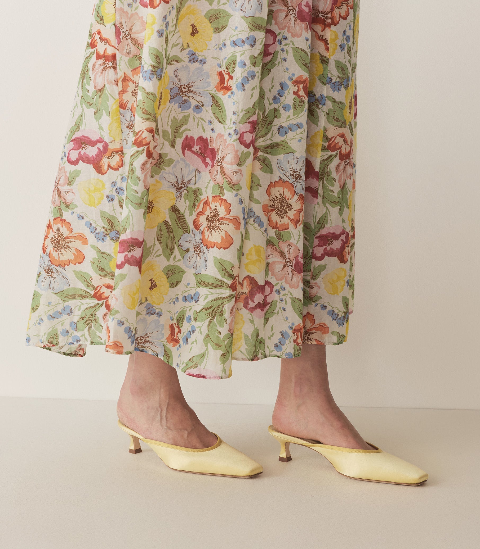 A timeless silk-satin mule with our signature grosgrain trim, the Luma Heel features an elongated, squared-off toe and a curved kitten heel.