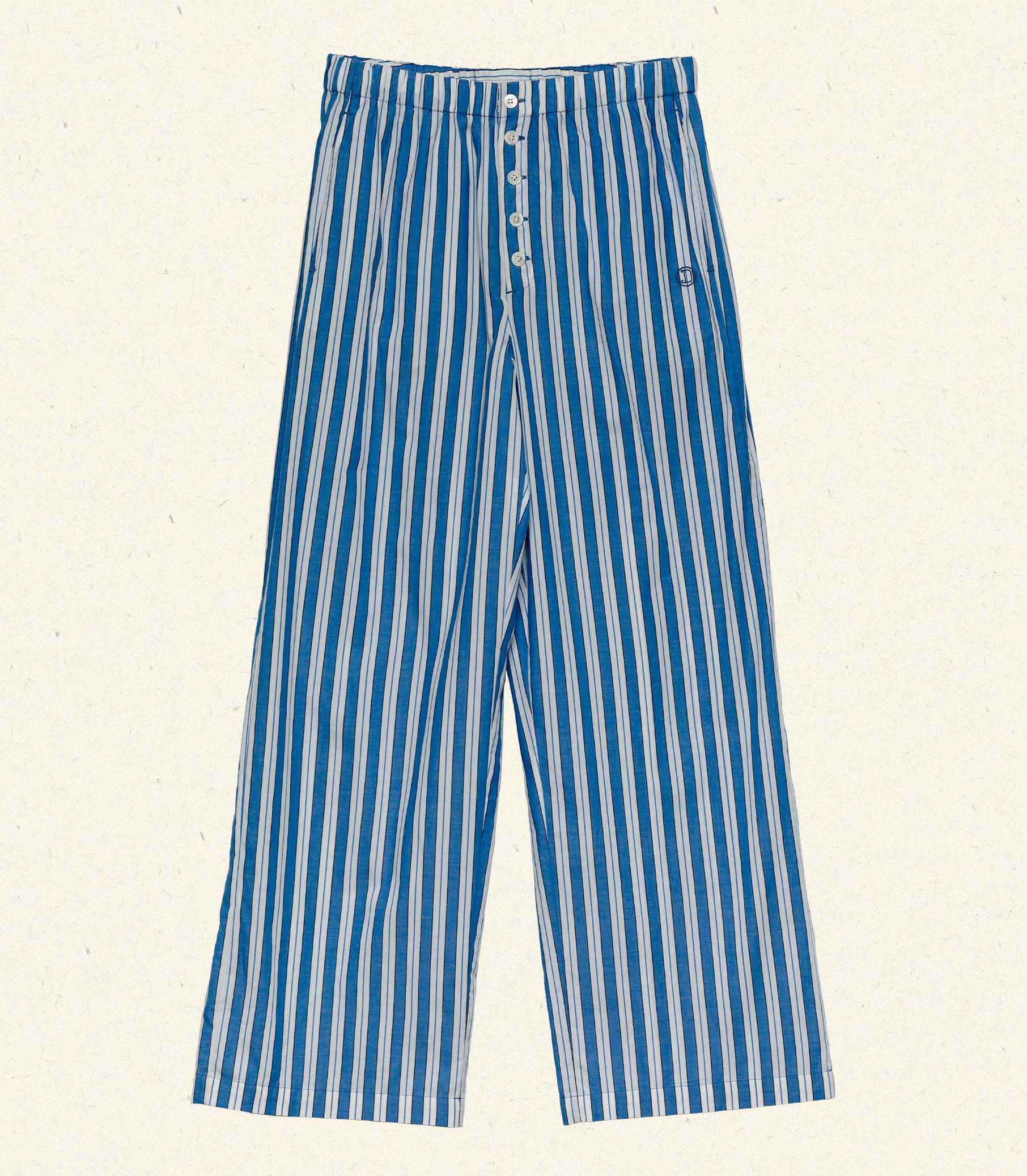 Tailored in crisp cotton and rendered in our yarn-dyed Lucerne Stripe, the Morgan Pant takes cues from vintage sleepwear, featuring a button fly, hidden drawstring, an elastic waistband, and an antique-inspired embroidered “D” at the pocket.