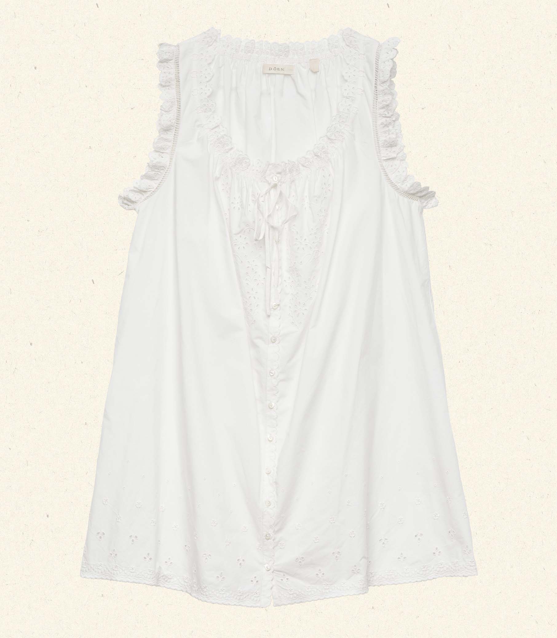 Crafted from crisp organic cotton poplin, the Nessie Dress—inspired by our best-selling Traveler Top—features a breezy silhouette with a scoop neckline, mother-of-pearl buttons, and a grosgrain ribbon tie. Scallop eyelet embroidery and ladder trim accent the neckline and sleeve openings, while a floral eyelet design accents the yoke and mini hemline.
