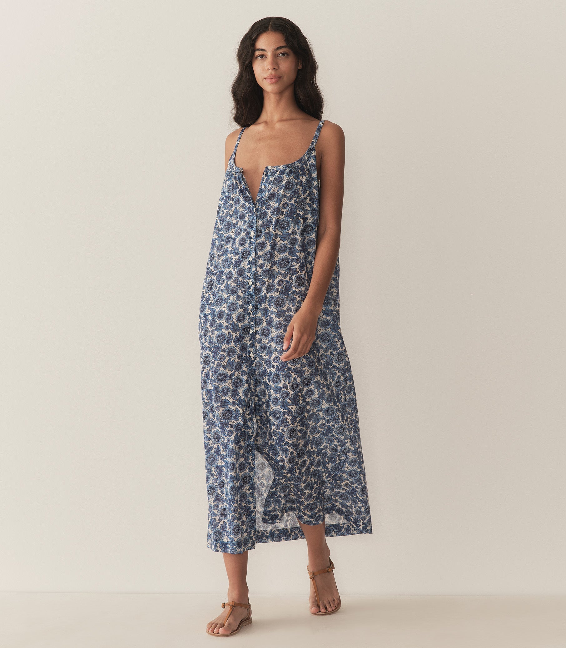 Light and breezy, the Nevita Dress is rendered in soft, organic cotton voile adorned with our Soleil Fleurit print—a motif inspired by an antique French block-printed quilt sourced by our co-founder Katherine. It features a gathered scoop neckline, slender straps, and a breezy silhouette with an adjustable waist tie. Mother-of-pearl buttons extend down the front.
