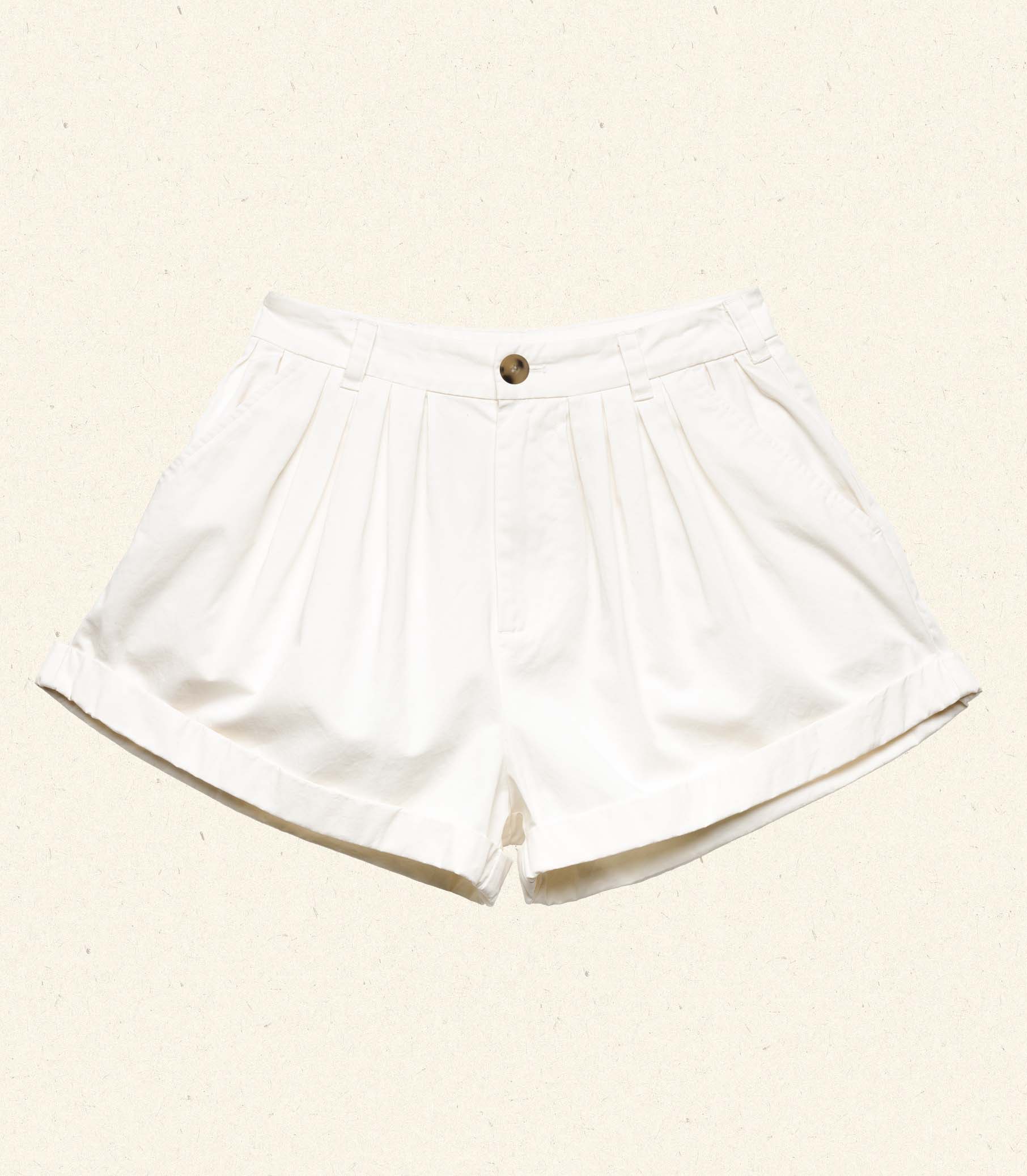 In 100% cotton twill, the Paige Short—a longtime favorite of our co-founders, Margaret and Katherine— features a high waist adorned with belt loops, a zipper fly, side pockets, and a single faux horn button closure. Pleats lend volume to the front and back, while a cuffed hem creates a rolled-up look.
