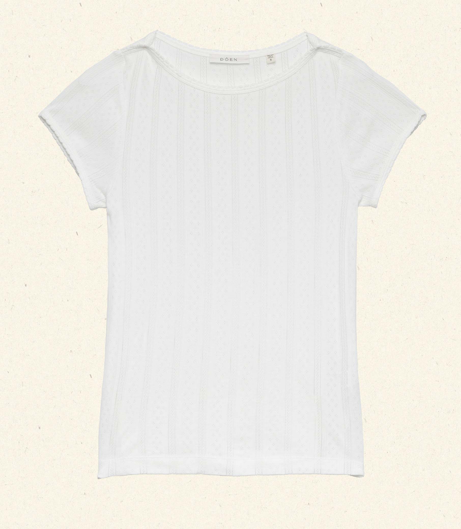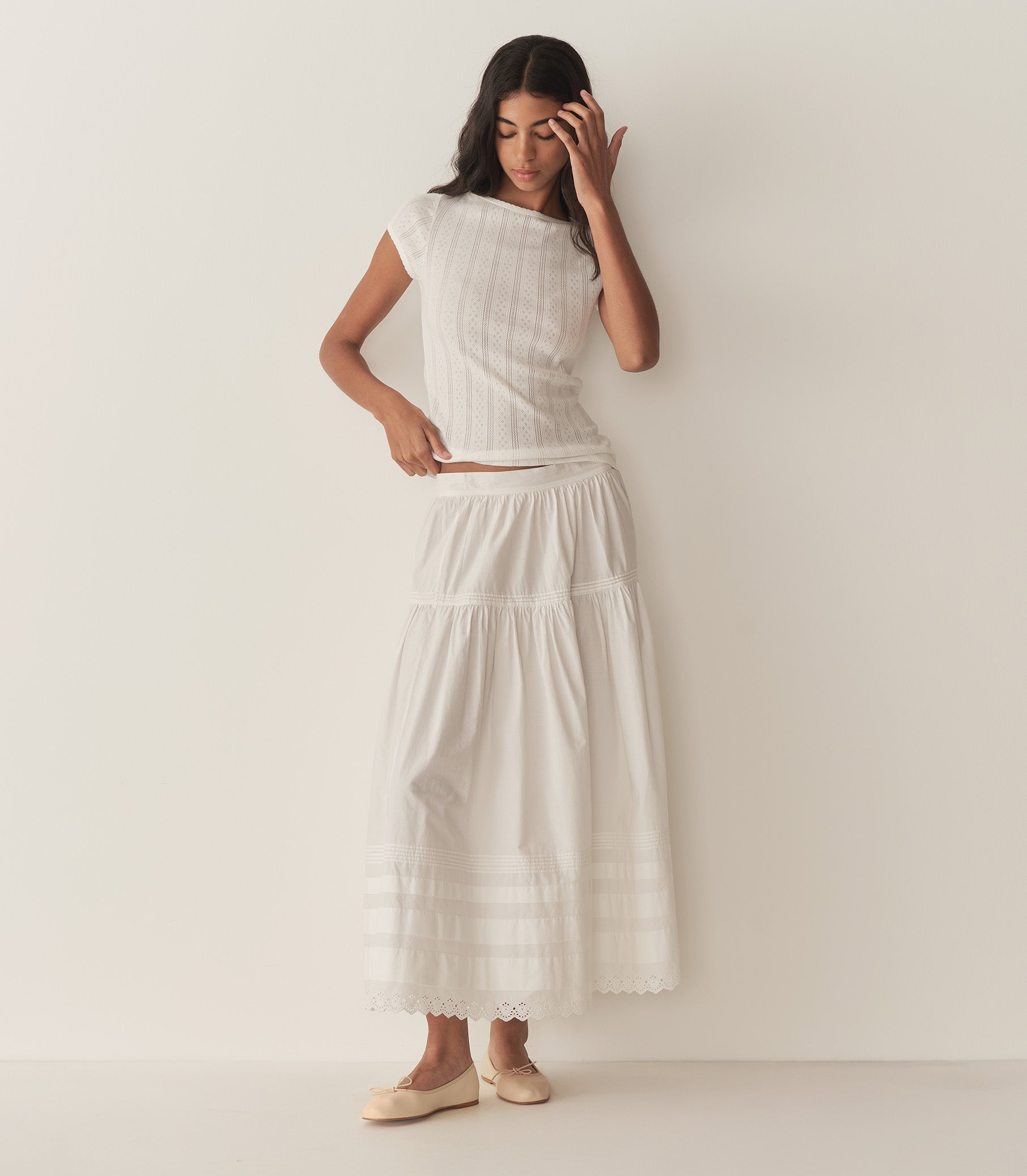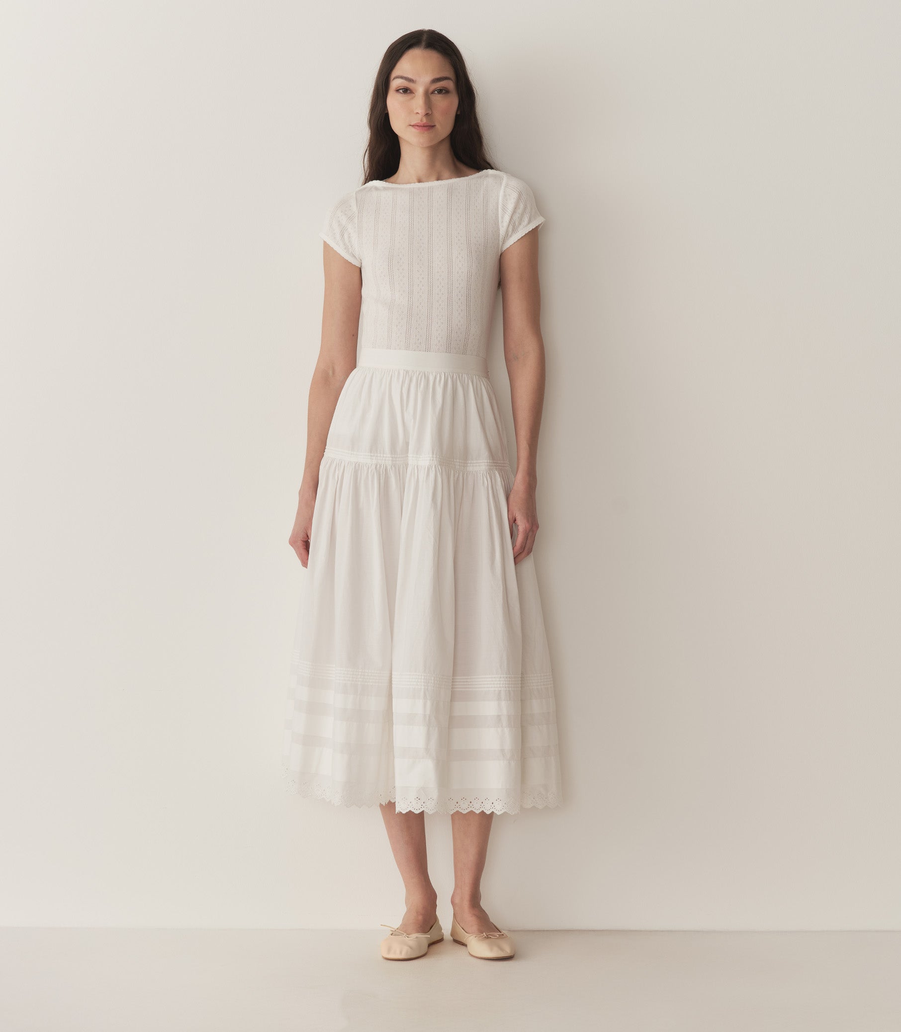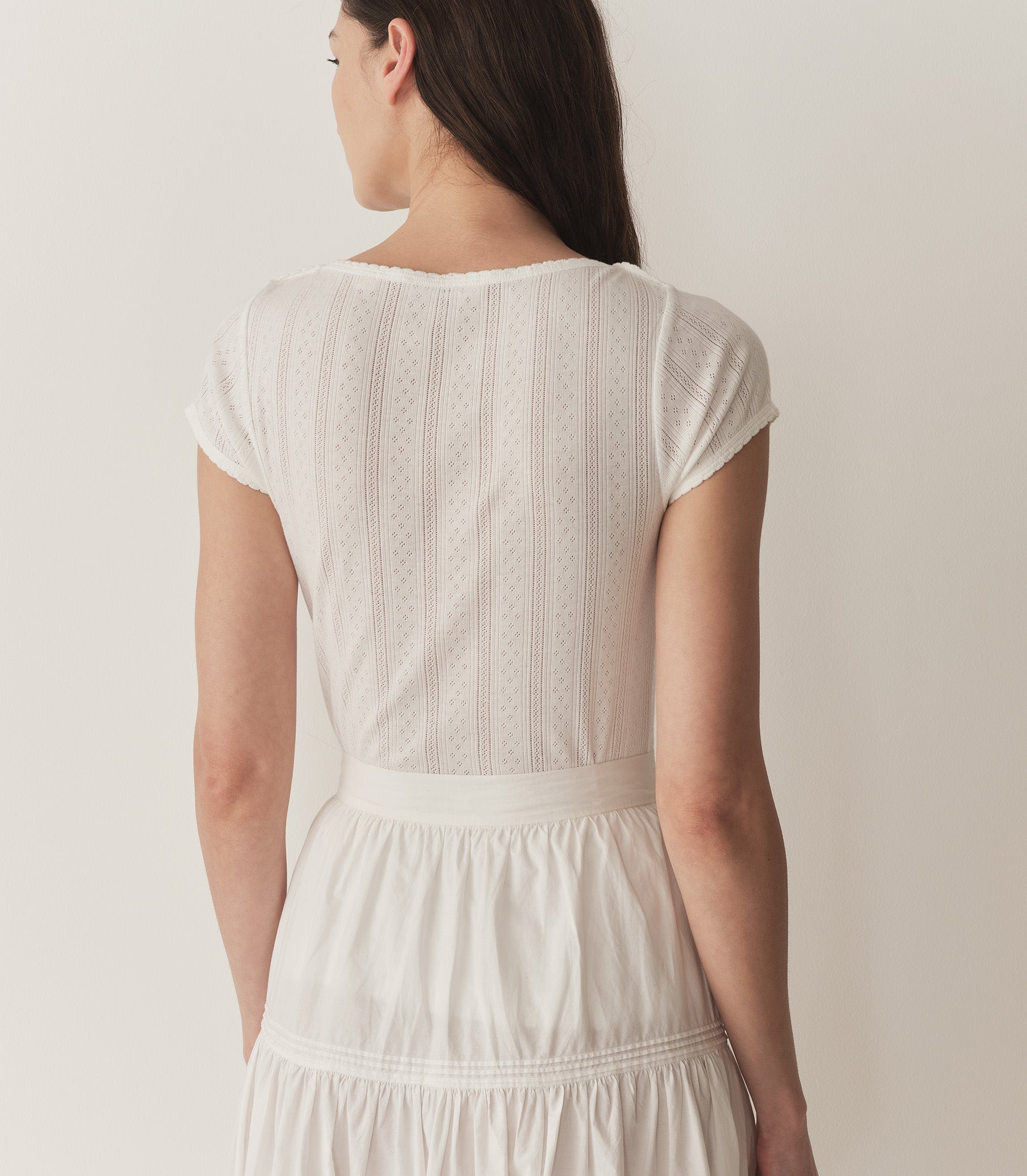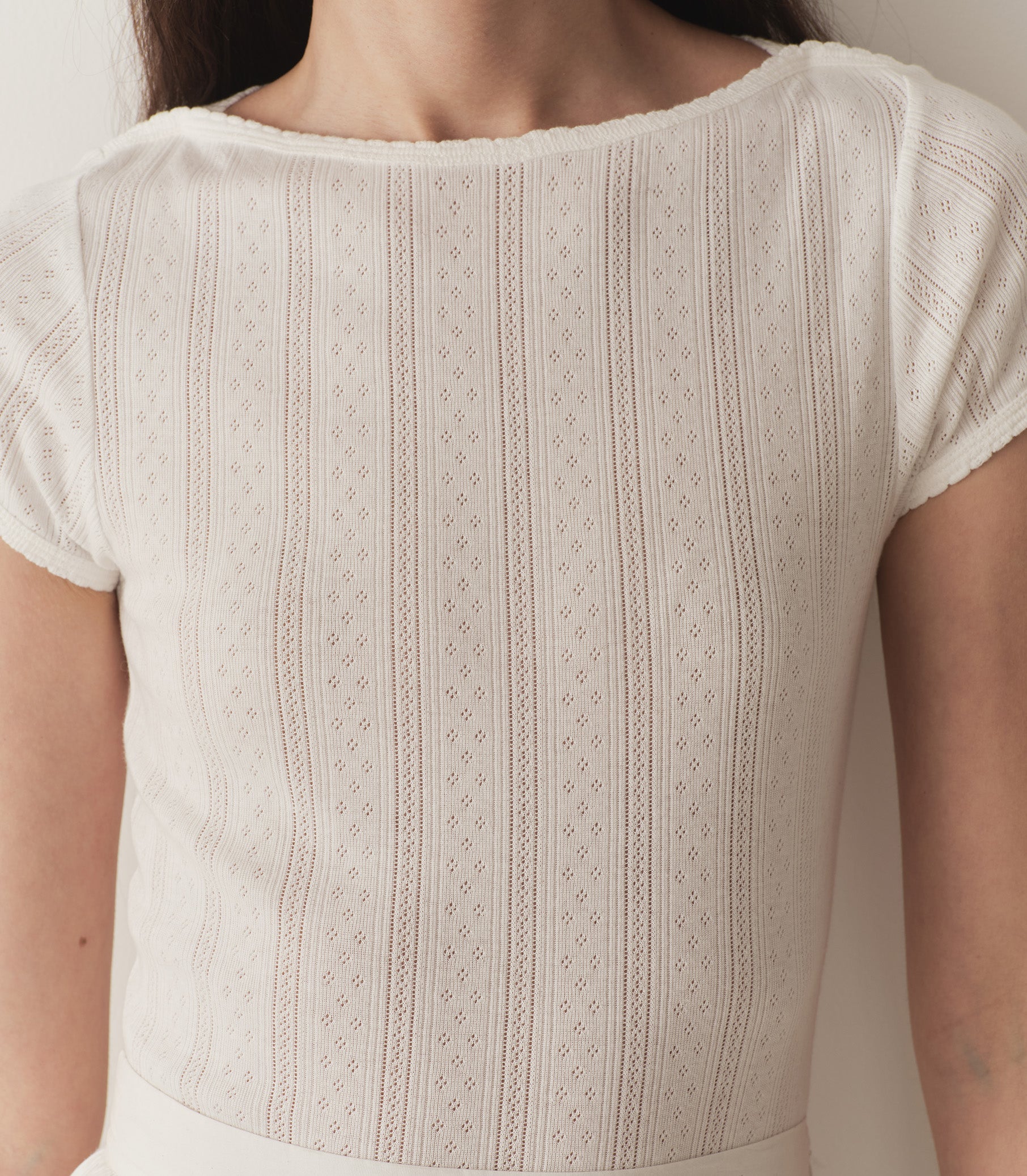 In the softest organic cotton pointelle, the ‘60s-inspired Pauline Tee features a bateau neckline, short sleeves, and a fitted silhouette. A delicate scallop binding details the neckline and sleeve edges.