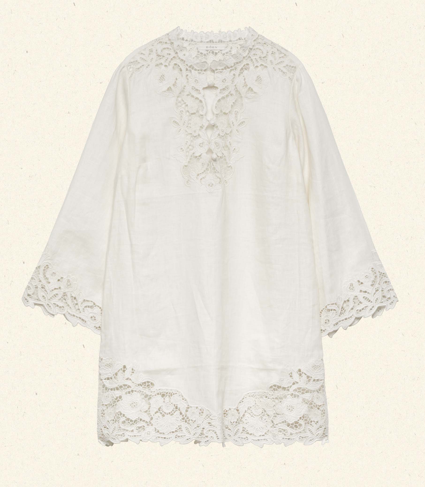 Crafted from crisp, lightweight linen, the ‘60s-inspired Rosélie Tunic features a high neck with a Nehru collar, three-quarter-length bell sleeves, and an A-line silhouette. Floral embroidery cutwork adorns the neckline, cuffs, and mini hemline, while hand-crocheted buttons extend down the front.