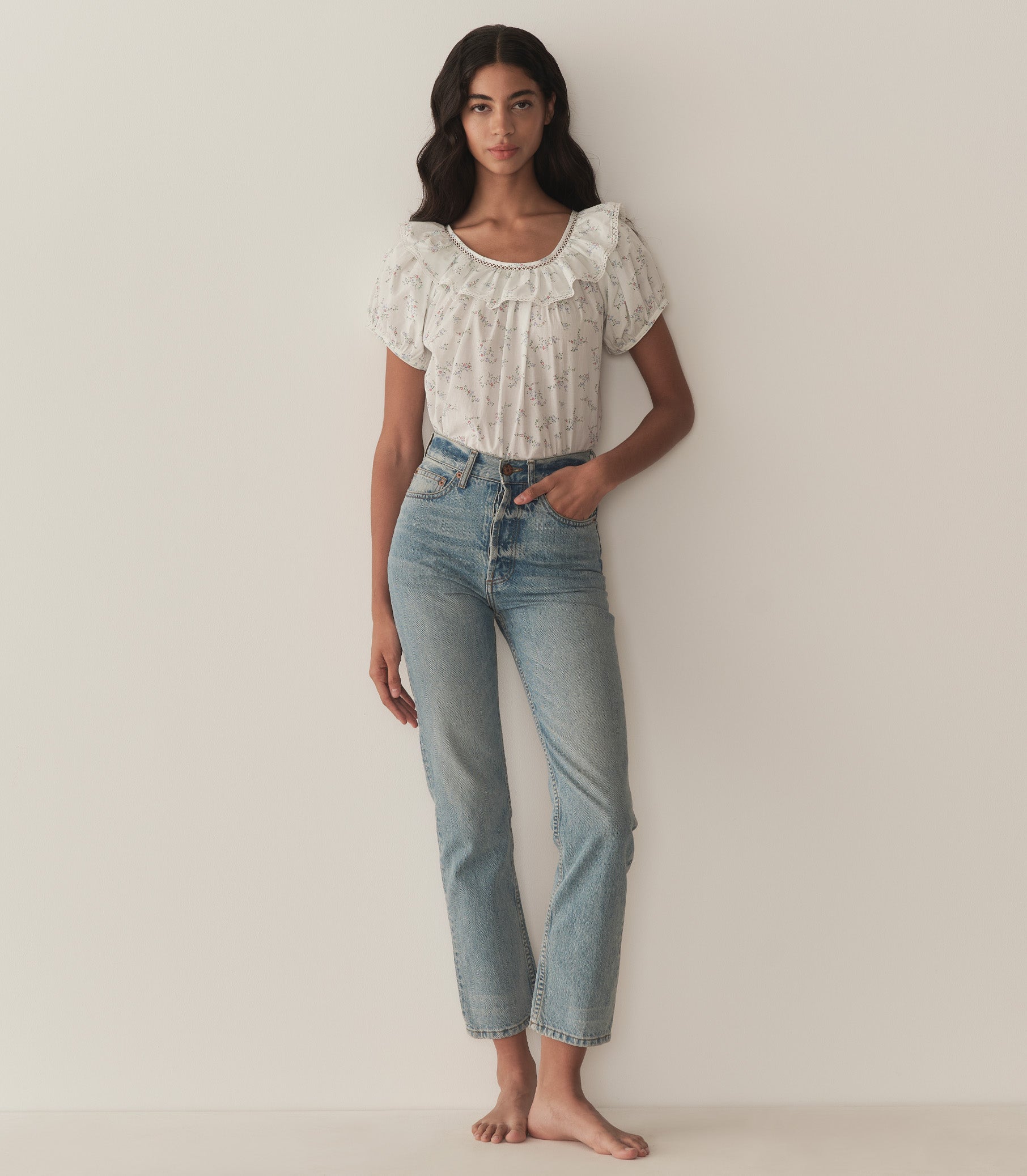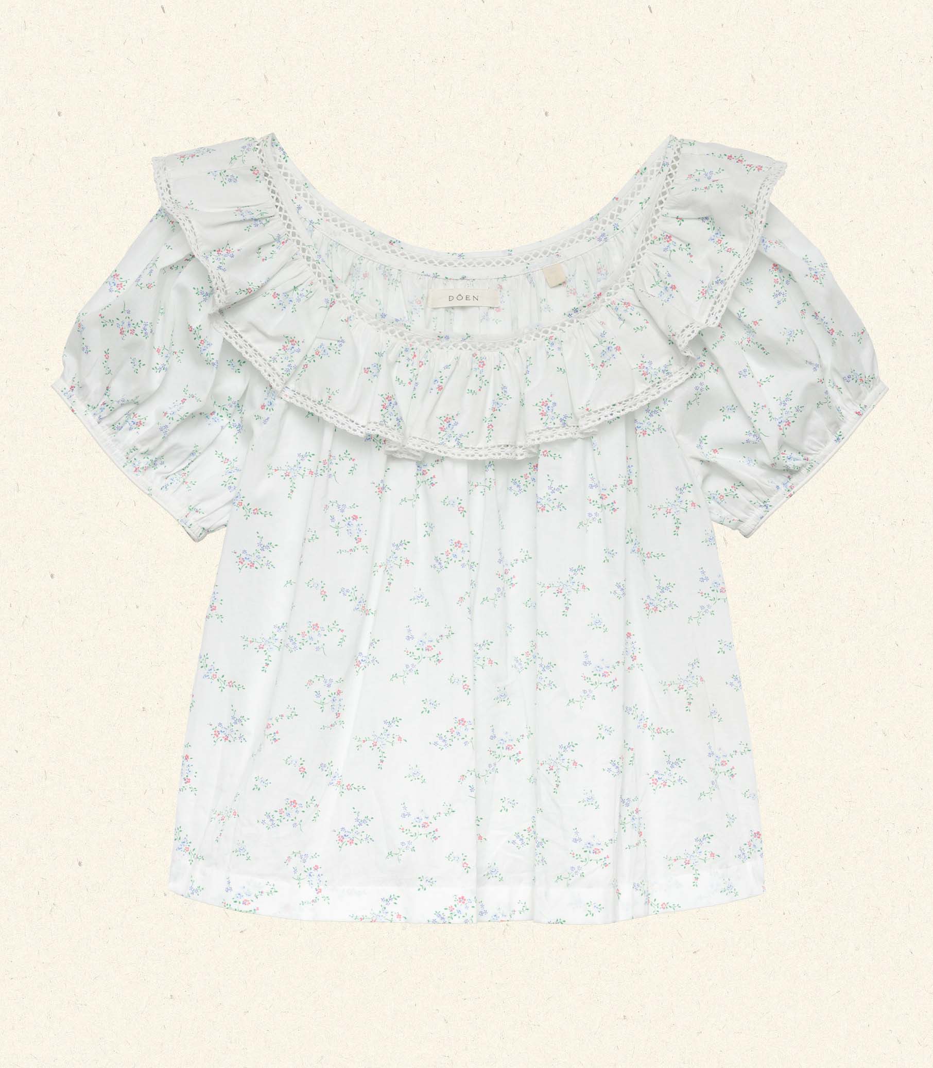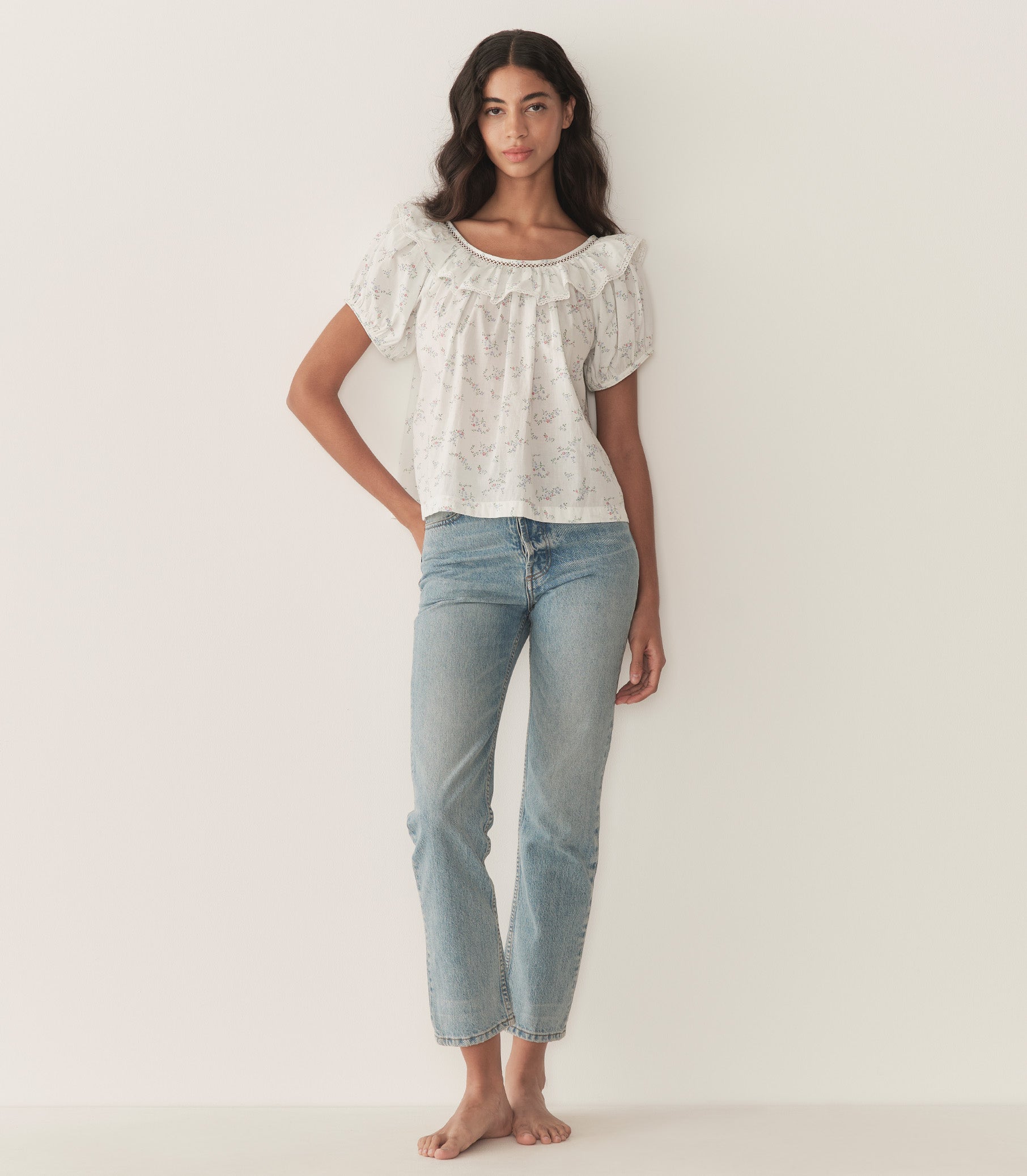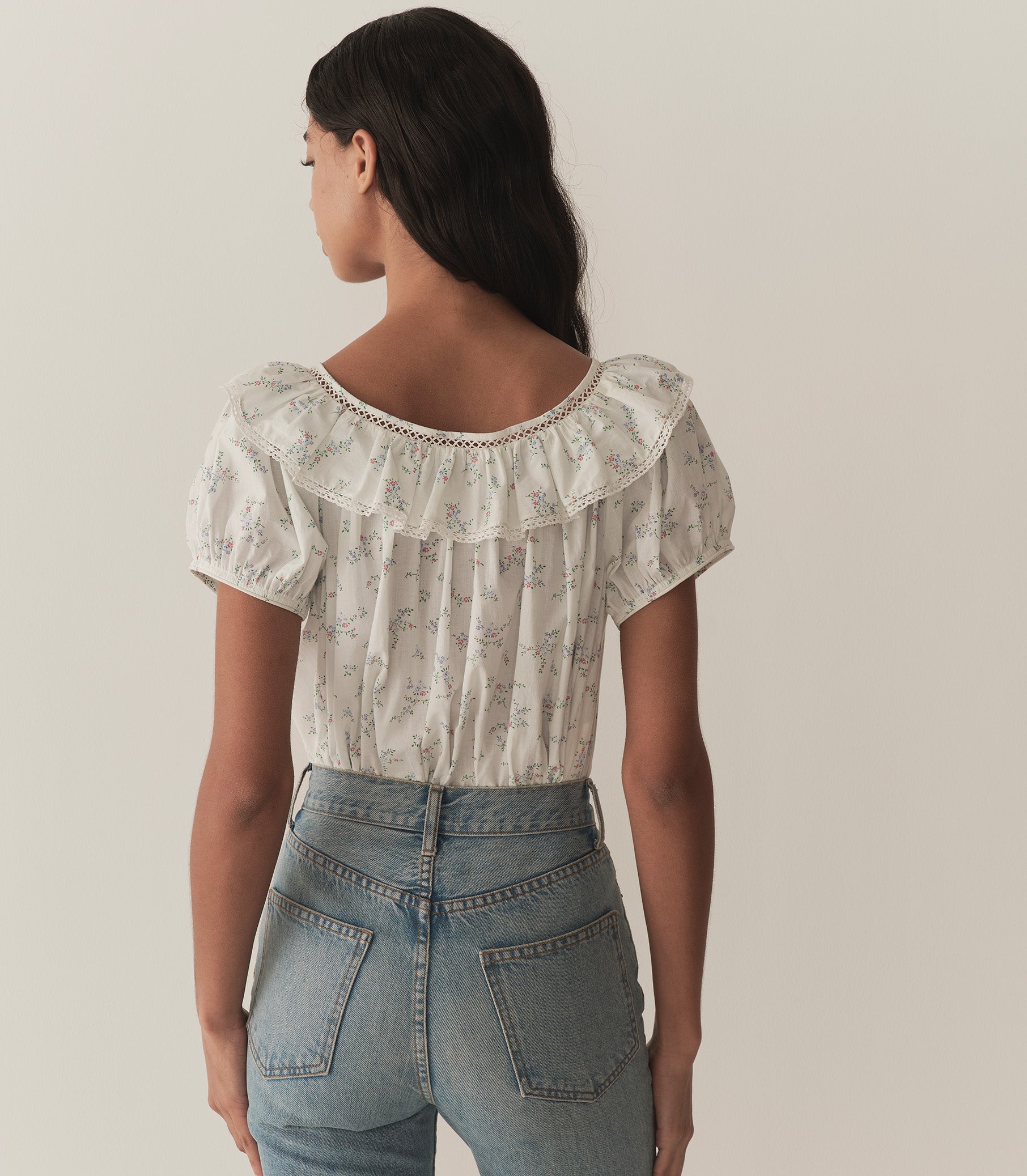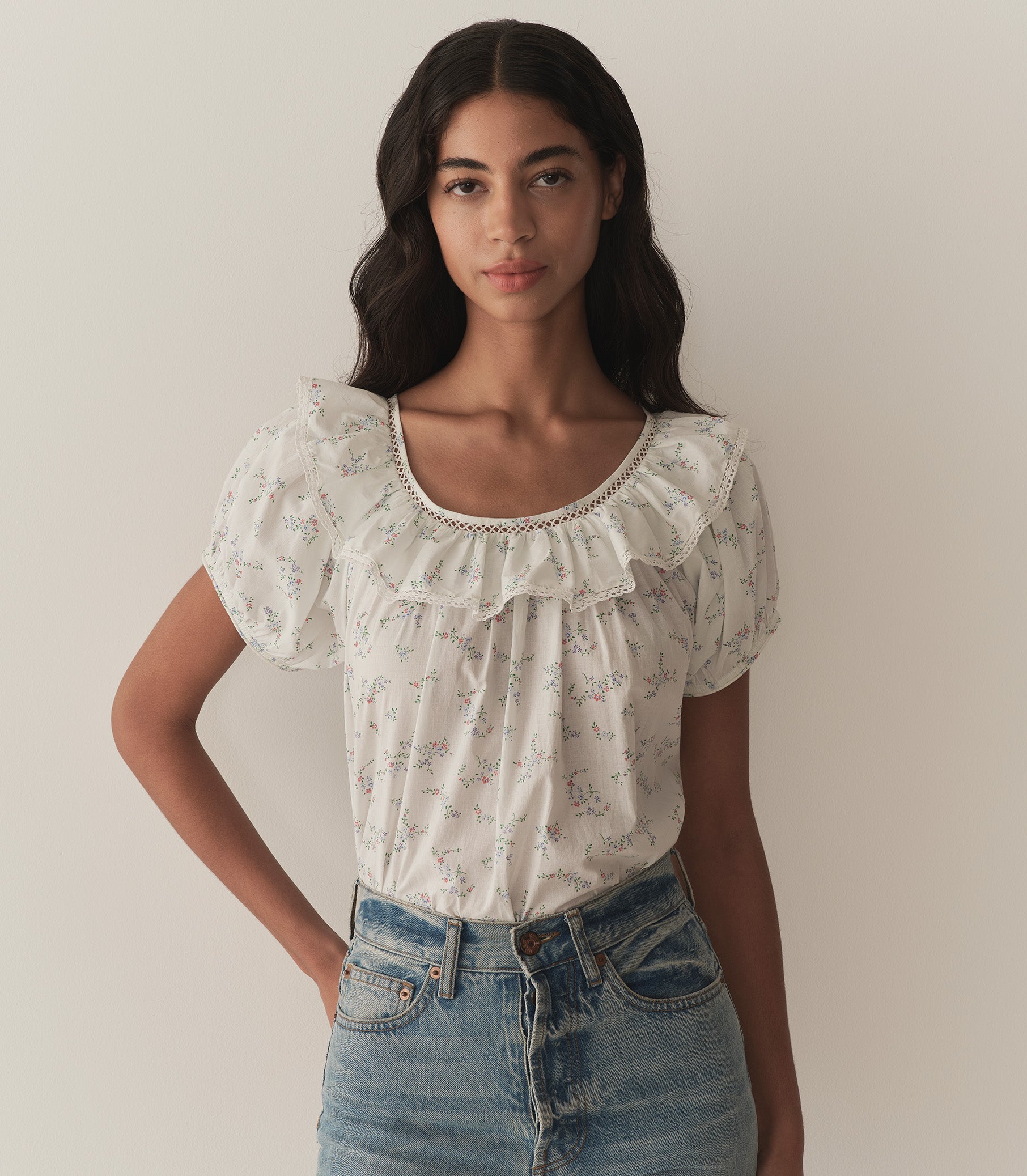 In soft organic cotton voile adorned with our Cottage Grove—a delicate floral inspired by a 1950s nightgown—the Silvie Top features a breezy silhouette with short puffed sleeves and a scoop neckline framed by a wide lace-trimmed ruffle. Wear it loose, or tuck it into your favorite high-waisted jeans.