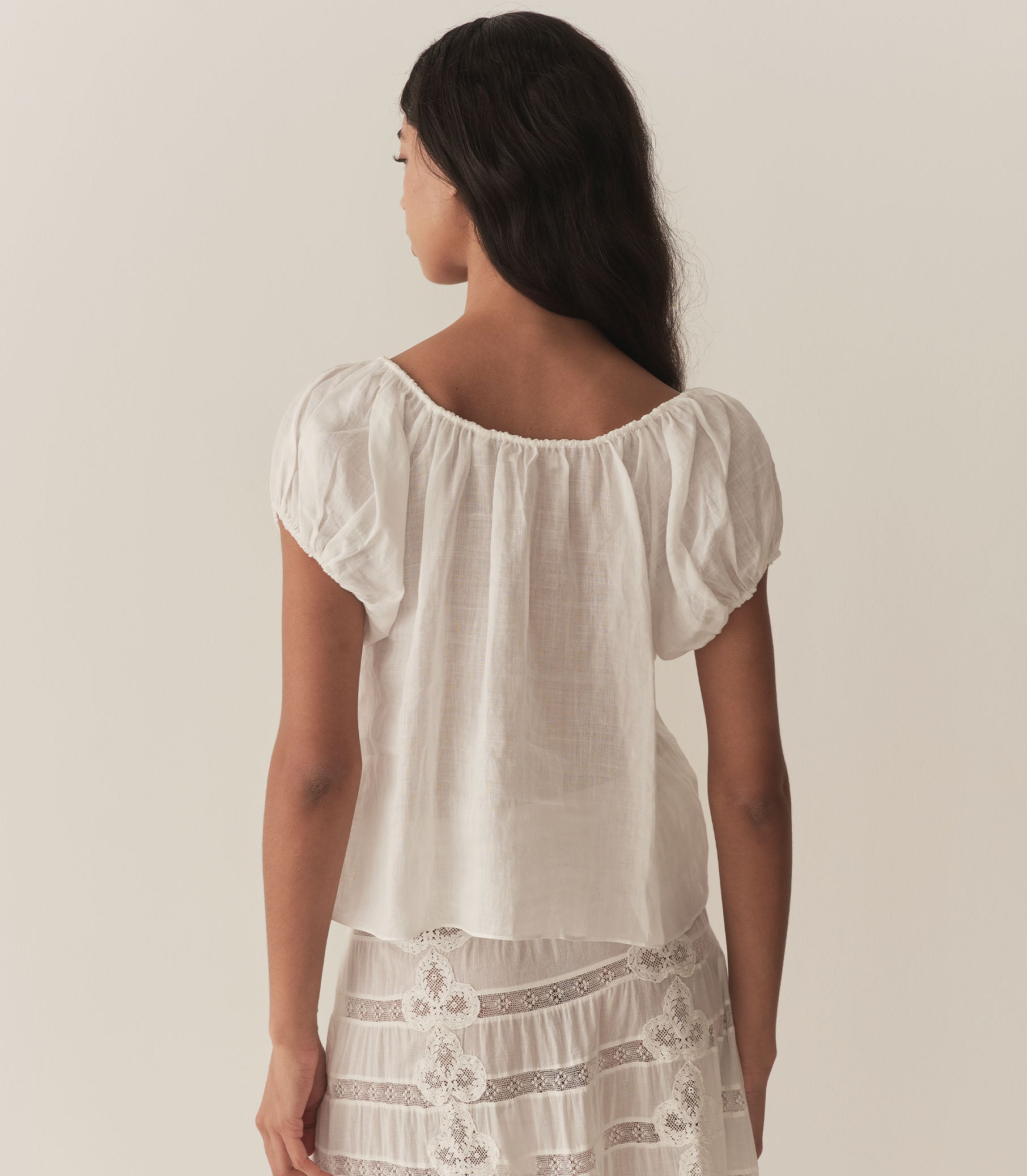 The Solina Top is crafted from lightweight ramie, featuring a breezy silhouette, short puffed sleeves, and a scoop neckline with an adjustable tie and playful keyhole detail.