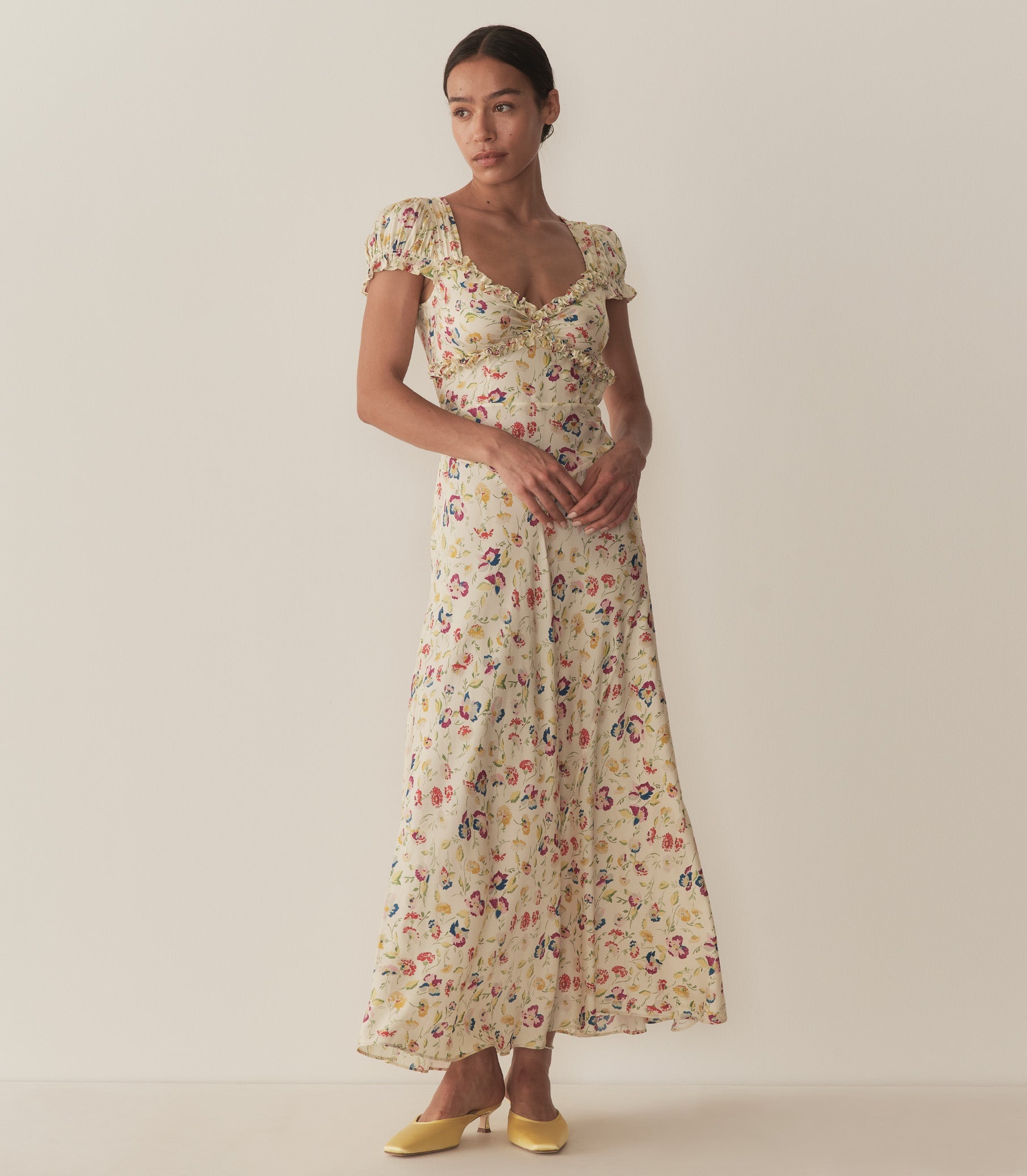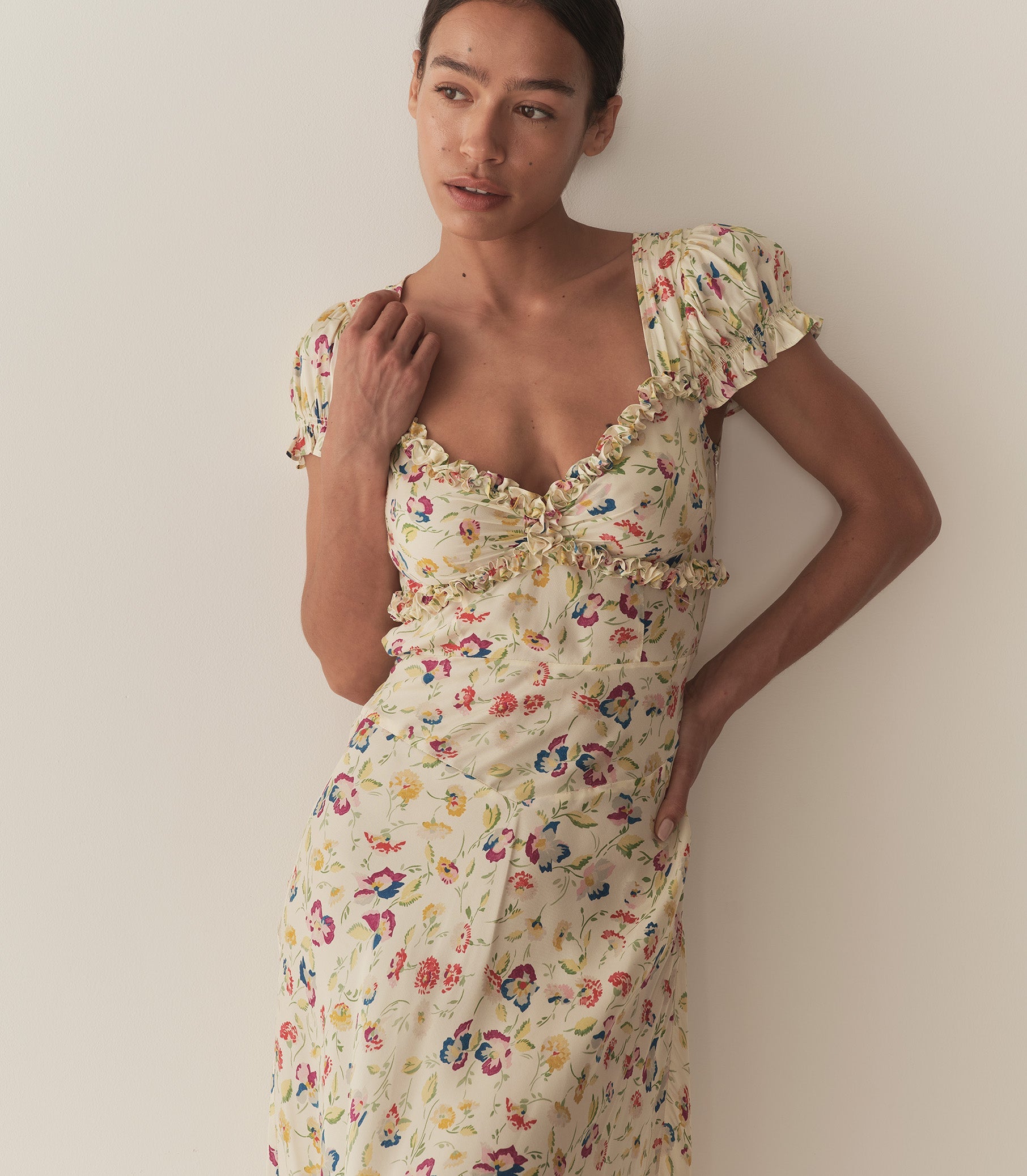 In silk-viscose twill graced with our ‘30s-inspired Windswept Blooms print, the Valerine Dress features short puffed sleeves and a sweetheart neckline trimmed with petite ruffles. A fitted waist yoke gives way to an ankle-grazing bias cut skirt, and an invisible side seam zipper offers the perfect fit.